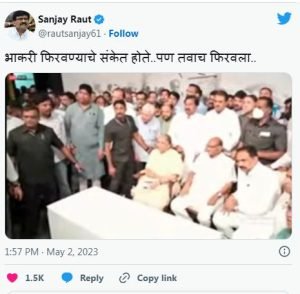 राष्ट्रवादी काँग्रेसच्या अध्यक्षपदावरुन निवृत्ती घेत असल्याचे शरद पवार यांनी सांगितले. मुंबईतील वाय बी चव्हाण सेंटरमध्ये ‘लोक माझे सांगाती’ या पुस्तकाच्या प्रकाशन सोहळ्यात ते बोलत होते. त्यावेळी त्यांनी या घोषणेनंतर उपस्थित कार्यकर्त्यांकडून पवारांच्या निर्णयाला तीव्र विरोध होत आहे. तसेच, तुमच्या नेतृत्त्वाशिवाय पक्ष नाही, असे म्हणत नेते, पदाधिकारी आणि कार्यकर्त्यांच्या डोळ्यात अश्रू तरळले. अजित पवार वगळता राष्ट्रवादीच्या सर्व कार्यकर्त्यांची पवारांना निर्णय मागे घेण्याची गळ घातली. तशातच शिवसेना उबाठाचे खासदार संजय राऊत यांनी ट्वीट करत रोखठोक प्रतिक्रिया दिली.