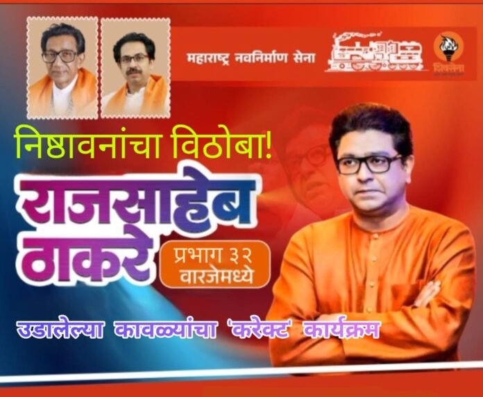 वारजे शिवणे परिसरात निष्ठावानांच पॅनल म्हणून घरोघरी पोहोचलेल्या महाराष्ट्र नवनिर्माण सेनेच्या उमेदवारांचे पक्षप्रमुख निष्ठावानांचा ‘विठोबा’ राज ठाकरे थेट प्रभाग क्रमांक 32 मधील कार्यकर्त्यांशी संवाद साधण्यासाठी वारजे माळवाडी मध्ये येणार असल्याने मनसैनिकांचा उत्साह शिगेला पोचला आहे. राजगादीसाठी अनेक पक्षांतरे आणि आरोप प्रत्यारोप सुरू असताना निष्ठावनांचे पॅनल फक्त वारजे भागातील नागरिकांची …. फक्त जनसेवा! या उदात्त हेतूने प्रचार करत असल्याने नुकत्याच हाती आलेल्या सर्वेक्षणानुसार या भागामध्ये महाराष्ट्र नवनिर्माण सेनेला दिलासादायक वातावरण निर्माण झाले आहे. विशिष्ट पातळीवर याची नोंद घेण्यात आल्याने कार्यकर्त्यांना योग्य दिशा आणि प्रचाराचा आढावा घेण्यासाठी दस्तूर खुद्दराज साहेब ठाकरे मैदानात उतरले आहेत.