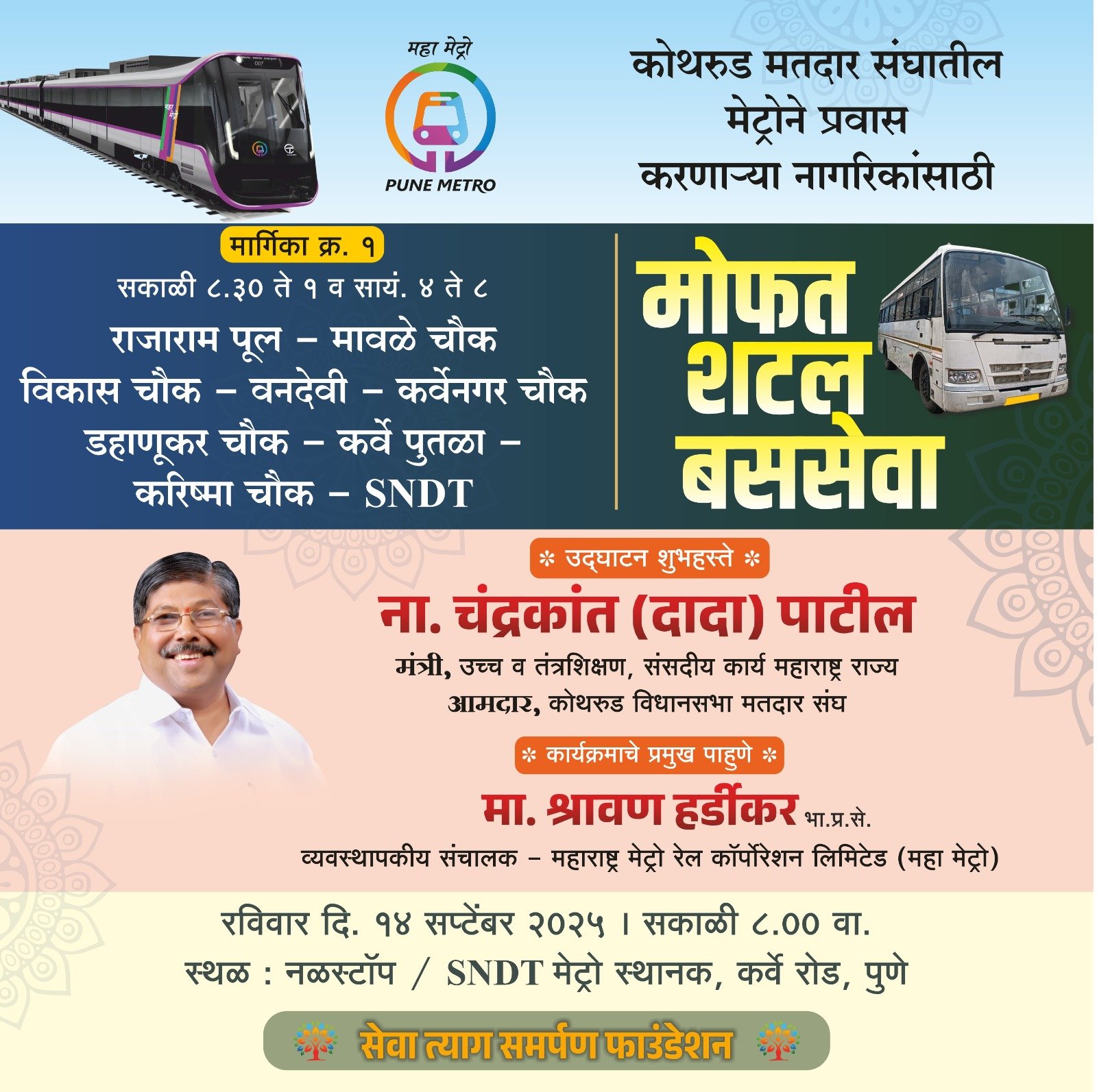 पुण्यातील सार्वजनिक वाहतूक सेवेची महामेट्रो जीवन वाहिनी बनत असतानाच कोथरूड विधानसभा मतदारसंघातील विद्यमान नामदार चंद्रकांत दादा पाटील यांच्या पुढाकाराने सेवा त्याग समर्पण फाउंडेशनच्या मार्फत कोथरूड विधानसभा मतदारसंघातील मेट्रो मार्गी के पासून दूर अंतरावर असलेल्या कर्वेनगर नवसाह्याद्री डहाणकर कॉलनी भागातील नागरिकांसाठी मोफत शटल बस सेवा सुरू करण्यात आली आहे. पुण्यातील महा मेट्रोचा पहिला प्रयोग म्हणून ज्या कोथरूड मतदारसंघातून शुभारंभ झाला त्या कोथरूड विधानसभा मतदारसंघातील मेट्रो मार्गीकेपासून दूर असलेल्या नागरिकांनाही मेट्रो प्रवास सुकर व्हावा या उदत्त हेतूने संबंधित उपक्रम सुरू करण्यात आला आहे.