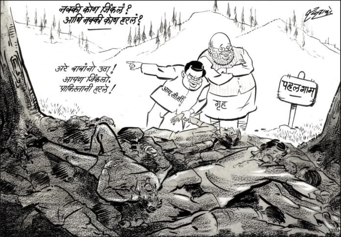 एप्रिल महिन्यात पहलगामध्ये दहशतवादी हल्ला झाला होता. यावेळी दहशतवाद्यांनी पर्यटकांना लक्ष्य केलं होतं. यावेळी त्यांना धर्मविचारून मारण्यात आलं होतं. या हल्ल्यानंतर मनसेने तीव्र निषेध नोंदवला होता. यावेळी राज ठाकरे यांनी केंद्र सरकारला ‘एकदाच दणका द्या’ अशी मागणी केली होती. आता या व्यंगचित्राद्वारे त्यांनी या हल्ल्यात मृत्यूमुखी पडलेल्यांकडे दुर्लक्ष होत असल्याची खंत व्यक्त केली आहे.