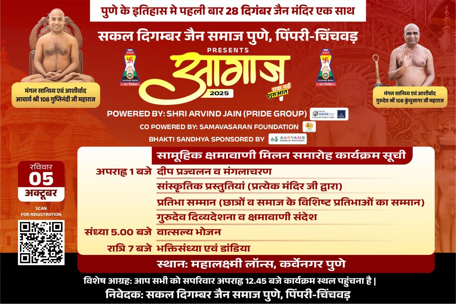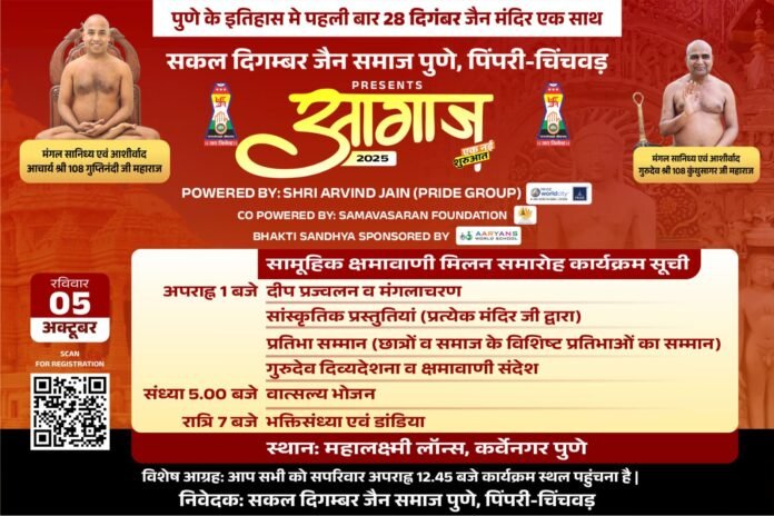 सकल दिगंबर जैन समाज पुणे व पिंपरी-चिंचवड यांच्या वतीने आयोजित, पुणे शहराच्या इतिहासात पहिल्यांदाच २८ दिगंबर जैन मंदिरांना एकत्र आणणारा आगज २०२५ हा भव्य सामूहिक क्षमावाणी व मिलन समारोह कार्यक्रमाचे आयोजन करण्यात आले आहे. हा आध्यात्मिक आणि सांस्कृतिक सोहळा कार्यक्रम रविवार दि. 5 ऑक्टोंबर 2025 रोजी कर्वेनगर येथील महालक्ष्मी लॉन्स येथे संपन्न होणार आहे.