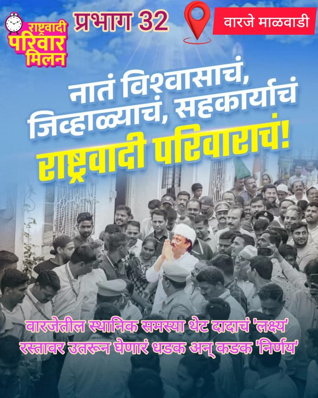 महाराष्ट्राचे उपमुख्यमंत्री अजित पवारांचा बालेकिल्ला म्हणजे वारजे माळवाडी! पुणे महापालिकेत समाविष्ट झाल्यापासून गेली 20 वर्ष (भारतीय जनता पक्षाची लाट आलेली असताना सुद्धा) कायम नगरसेवकांच्या अंगावर विजय गुलाल देणाऱ्या भागातील स्थानिक समस्या सोडवण्यासाठी दस्तूरखुद्द अजितदादा पवार यांनीच लक्ष घातले असून आता ‘दादांचा वादा’च वारजे माळवाडीला मोकळा श्वास घेण्यास मदत करणार आहे. आजपर्यंत नुसत्या हिरवळीच्या लॉन्सच्या जीवावर वारजे बलतेय अन् काम म्हणजे….. अशा वल्गनापेक्षा प्रत्यक्षात स्थानिक नागरिकांच्या समस्या जाणून घेण्यासाठी उद्या सकाळी अन दुपारी राष्ट्रवादी परिवार मिलन!च्या निमित्ताने वारजे माळवाडी भागात दौऱ्याचे नियोजन करण्यात आले आहे. वारजे माळवाडीतील अजितदादा पवार यांचे अत्यंत विश्वासू माजी उपमहापौर दिलीपभाऊ बराटे व माजी विरोधी पक्ष नेत्या दिपालीताई बाबा धुमाळ यांच्या सर्वांगीण आणि सर्व समावेशक विकासाच्या भूमिकेला पाठिंबा देण्यासाठी राज्याचे उपमुख्यमंत्री अजितदादा पवार उद्या दुपारी थेट नागरिकांच्या समस्या जाणून घेण्यासाठी यशोदीप चौक व व्हायला चौक येथे ‘राष्ट्रवादी परिवार मिलन’ या उपक्रमांतर्गत जनसंवाद करणार आहेत.