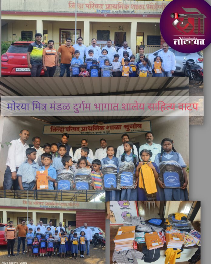 मोरया मित्र मंडळाने या वर्षी सार्वजनिक गणेशोत्सव काळात तुमचे शैक्षणिक दान ठरेल विद्यार्थांसाठी योगदान हा उपक्रम राबविला होता. यामध्ये आवाहन करण्यात आले होते की श्री गणेश चरणी कोणत्याही प्रकारचा प्रसाद, हार, नारळ, पेढे अर्पण न करता वही, पेन, दप्तर, शालेय साहित्य अर्पण करावे ह्या उपक्रमाला भरभरून प्रतिसाद नागरिक, हितचिंतक, वर्गणीदार यांनी दिला. ह्यामध्ये भरपूर प्रमाणात वह्या, पुस्तके, दप्तर, कपडे जमा झाले. ते सर्व साहित्य मुळशी तालुक्यातील दुर्गम भाग भोईनी, मुगाव ,गडले ह्या भागात वाटप करण्यात आले. यावेळी मुलांना पहिली ते चौथी मुलांसाठी चित्रकला वही, इंग्रजी अंक,अक्षर सरावासाठी पुस्तके, दप्तर,पेन, पेन्सिल, कपडे, रंग पेटी इत्यादी साहित्य वाटप करण्यात आले.