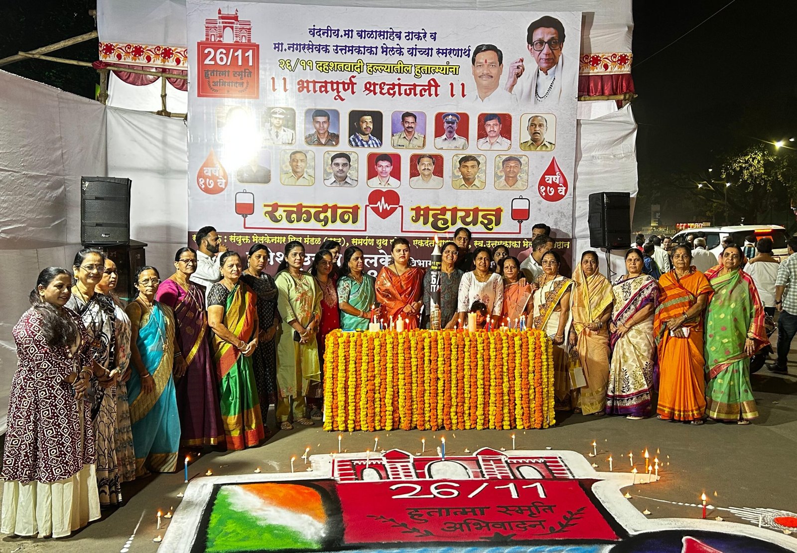 पुणे : स्वर्गीय उत्तमकाका भेलके प्रतिष्ठान, संयुक्त भेलकेनगर मित्र मंडळ ट्रस्ट, समर्पण युथ फोरम, एकदंत वाद्य पथक आणि शिवसेना विभाग संघटक उमेश भेलके मित्र परिवार यांच्या संयुक्त विद्यमाने भेलकेनगर चौक, कोथरूड येथे २६/११ मुंबई दहशतवादी हल्ल्यातील वीर हुतात्म्यांच्या स्मृतिप्रीत्यर्थ १७वे भव्य रक्तदान शिबिर भव्य उत्साहात पार पडले. याप्रसंगी शाम देशपांडे, पृथ्वीराज सुतार, किशोर शिंदे, योगेश मोकाटे, मंदार बलकवडे, संदीप मोकाटे, राम थरकुडे, अजय भुवड, जयदीप पडवळ , सचिन धनकुडे, चेतन भालेकर यांच्यासह प्रशासकीय, सामाजिक, राजकीय आणि सांस्कृतिक क्षेत्रातील अनेक मान्यवरांसह परिसरातील नागरिक देखील मोठ्या संख्येने उपस्थित होते.
