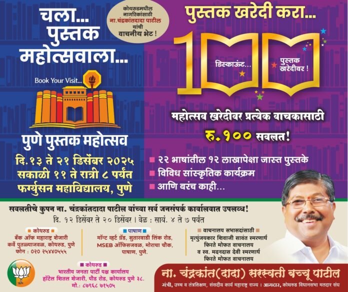 राष्ट्रीय पुस्तक ट्रस्ट, शिक्षण मंत्रालय, भारत सरकार आणि महाराष्ट्र शासन यांच्या संयुक्त विद्यमाने ‘पुणे पुस्तक महोत्सव २०२५’ १३ ते २१ डिसेंबर २०२५ दरम्यान फर्गुसन कॉलेज येथे आयोजन करण्यात आले आहे. या महोत्सवात जास्तीत जास्त वाचकांनी भेट देऊन; आपल्या आवडत्या पुस्तकांचा मनमुराद आनंद लुटावा; यासाठी राज्याचे उच्च व तंत्रशिक्षण मंत्री आणि कोथरुडचे आमदार चंद्रकांतदादा पाटील यांनी विशेष पुढाकार घेतला आहे.