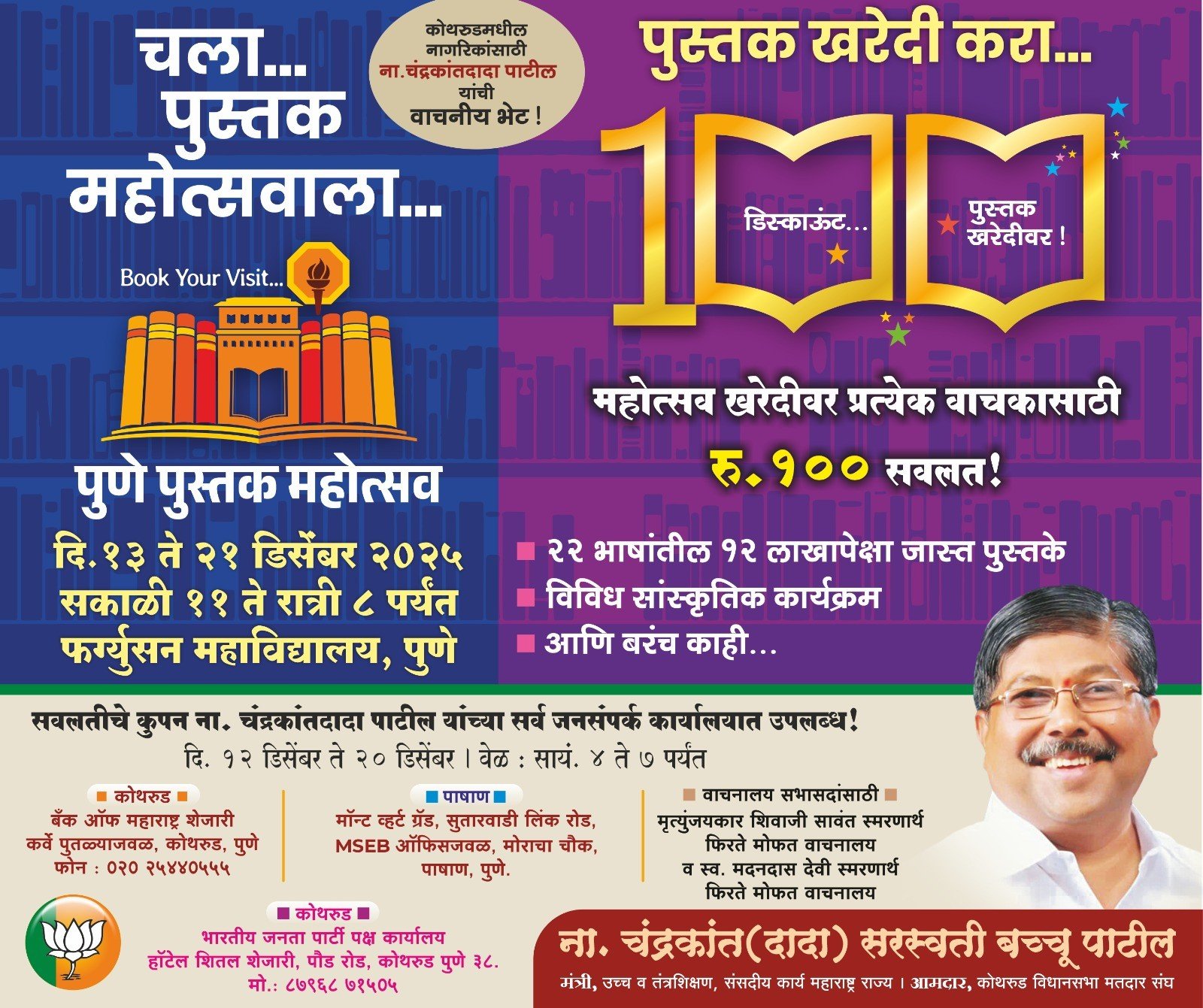 ना. पाटील यांनी कोथरुड मतदारसंघातील वाचकांनी पुस्तक खरेदी करावी; यासाठी विशेष सवलत योजना राबविली असून, एकूण पुस्तक खरेदीवर १०० रुपयांची विशेष सवलत देऊ केली आहे. यासाठी ना. चंद्रकांतदादा पाटील यांनी विशेष कुपन उपलब्ध करुन दिले असून, दिनांक १२ डिसेंबर ते २० डिसेंबर २०२५ दरम्यान, ना. पाटील यांच्या सर्व जनसंपर्क कार्यालयात सायंकाळी ४ ते ७ यावेळेत उपलब्ध करुन देण्यात आले आहेत. नागरिकांनी याचा लाभ घ्यावा, असे आवाहन ना. पाटील यांनी यानिमित्ताने केले आहे.