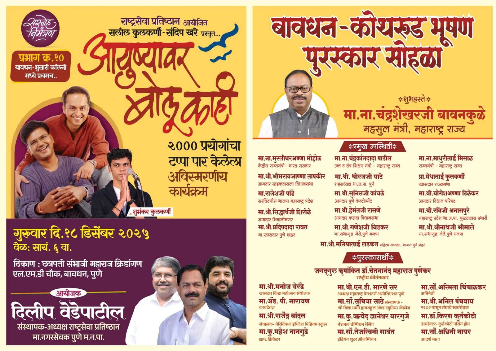 बावधन परिसरात होणाऱ्या कार्यक्रमाचे विशेष आकर्षण म्हणजे सलील कुलकर्णी यांचा मुलगा शुभंकर कुलकर्णी त्याच्या विशेष सादरीकरणाचे आयोजन करण्यात आले असून आज संध्याकाळी वेळ: सायं. ६ वा. छत्रपती संभाजी महाराज क्रिडांगण एल.एम.डी चौक, बावधन, पुणे येथे दिलीप वेडेपाटील संस्थापक-अध्यक्ष राष्ट्रसेवा प्रतिष्ठान मा. नगरसेवक पुणे म.न.पा. यांच्यावतीने अविस्मरणीय कार्यक्रमाचे आयोजन करण्यात आले आहे. या कार्यक्रमांमध्ये परिसरातील सन्माननीय व्यक्तिमत्त्वांना बावधन-कोथरुड भूषण पुरस्कार देऊन सन्मानित करण्यात येणार आहे. यामध्ये जगद्गुरु कृपांकित डॉ. चेतनानंद महाराज (पुणेकर राष्ट्रीय कीर्तनकार), मा.श्री.एन.डी. मारणे सर (अध्यक्ष महाराष्ट्र पेन्शनर्स असोसिएशन पुणे), मा. सौ. सुचित्रा साठे (संस्थापक-श्री विद्या भवन हायस्कूल अॅण्ड ज्युनियर कॉलेज), मा. कु. ऋवेद ज्ञानेश्वर बारगुजे (नॅशनल चॅम्पियन रेसिंग), मा.सौ. तेजस्विनी सावंत (इंडियन शूटर ऑलम्पियन), मा.श्री. मनोज येरंडे, (खासदार किडा महोत्सव संयोजक), मा. अॅड. पी. नारायण (कायदेतज्ञ), मा.श्री. राजेंद्र बांदल (संचालक-पैरिविंकल इंग्लिश मिडियम स्कूल), मा. कु. महेश नानगुडे (ISPL क्रिकेटर), मा. सौ. अस्मिता चिंचाळकर (अभिनेत्री), मा. श्री. अनिल पंचवाघ (१९७२ पासून संघाचे स्वयंसेवक), मा.डॉ. किरण कुर्तकोटी (डायरेक्टर- कुर्तकोटी नर्सिंग होम), मा. सौ. अश्विनी नायर (आदर्श माता) यांचा गौरव करण्यात येणार आहे.