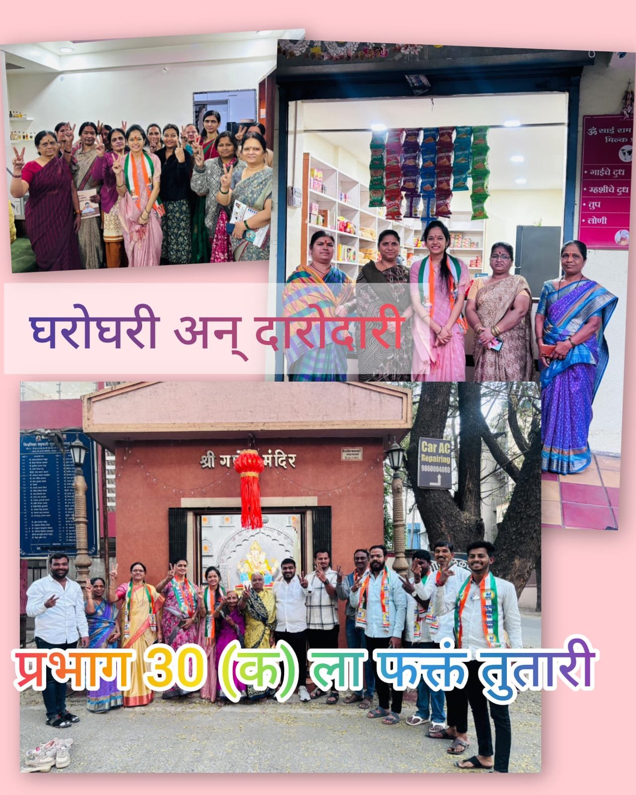 मनिषाताई विरेश शितोळे यांच्या वतीने व्यक्तिगत गाठीभेटी घेऊन नागरिकांच्या विकासाचे लक्ष्य गाठण्यासाठी 30 क मधून ‘तुतारी’ निशाणीला मतदान करण्याचे आव्हान करण्यात येत आहे. राष्ट्रवादी काँग्रेस पक्षाचे अधिकृत उमेदवार मनीषा शितोळे यांनी सध्या प्रभाग क्रमांक 30 कर्वेनगर हिंगणे होम कॉलनी परिसरातील जीवाभावाच्या बांधवांच्या आणि माता-भगिनींच्या व्यक्तिगत गाठीभेची सुरू केल्या असून या गाठीभेटीलाही विक्रमी प्रतिसाद मिळत आहे. परिसरातील श्रीमान सोसायटी, कर्वेनगर गल्ली नंबर 1 ते 10, मावळे आळी, वनदेवी टेकडी परिसर, कर्वेनगर गावठाण, आकाशनगर, कॅनॉल रोड परिसर, शाहू कॉलनी, काकडी सिटी, न्यू कोपरे पुनर्वसन, भालेकर वस्ती, दुधाने नगर, भारत कॉलनी, राजाराम पूल परिसर, हिंगणे होम कॉलनी भागात उत्साही स्वागत आणि मनमोकळ्या गप्पा यामुळे कर्वेनगर परिसरामध्ये 30 क मधून ‘तुतारी’च्या पसंती सुप्त लाट सुरू झाली आहे.