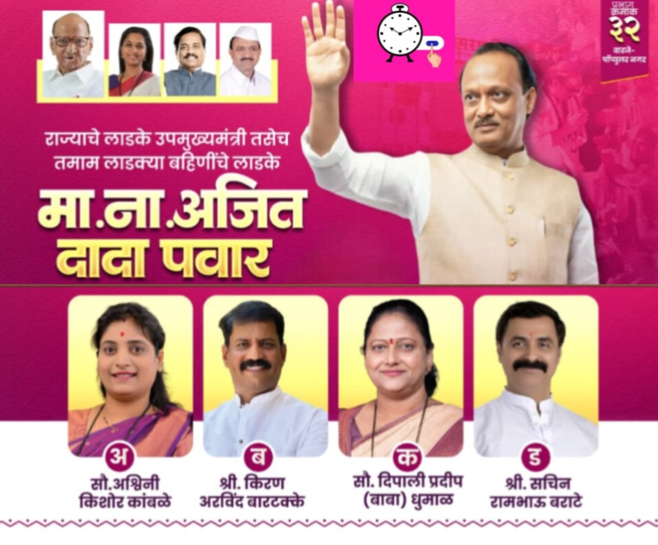 प्रभाग क्रमांक 32 वारजे – पॉप्युलरनगर शिवणे भागात पारंपरिक विरोधक असलेल्या राष्ट्रवादी काँग्रेस पक्षाने मात्र हार न मानता काँग्रेस भाजपा पक्षामध्ये सक्रिय असलेले 2 चेहरे आयात करून येनवेळी भाजपला तगडी लढत देण्याची नियोजन केले. विरोधकांनी विजयाचे सोनेरी ‘दिवास्वप्न’ पाहण्याची रणनीती करणाऱ्या संधी साधू लोकांना धडे शिकवण्यासाठी मतदारांची एक सुप् लाट तयार झाली असून याच भूमिकेला पाठबळ देण्यासाठी आज परिसरामध्ये अजित पवार अधिकृत उमेदवारांसाठी मतांचा कौल मागणार आहेत.