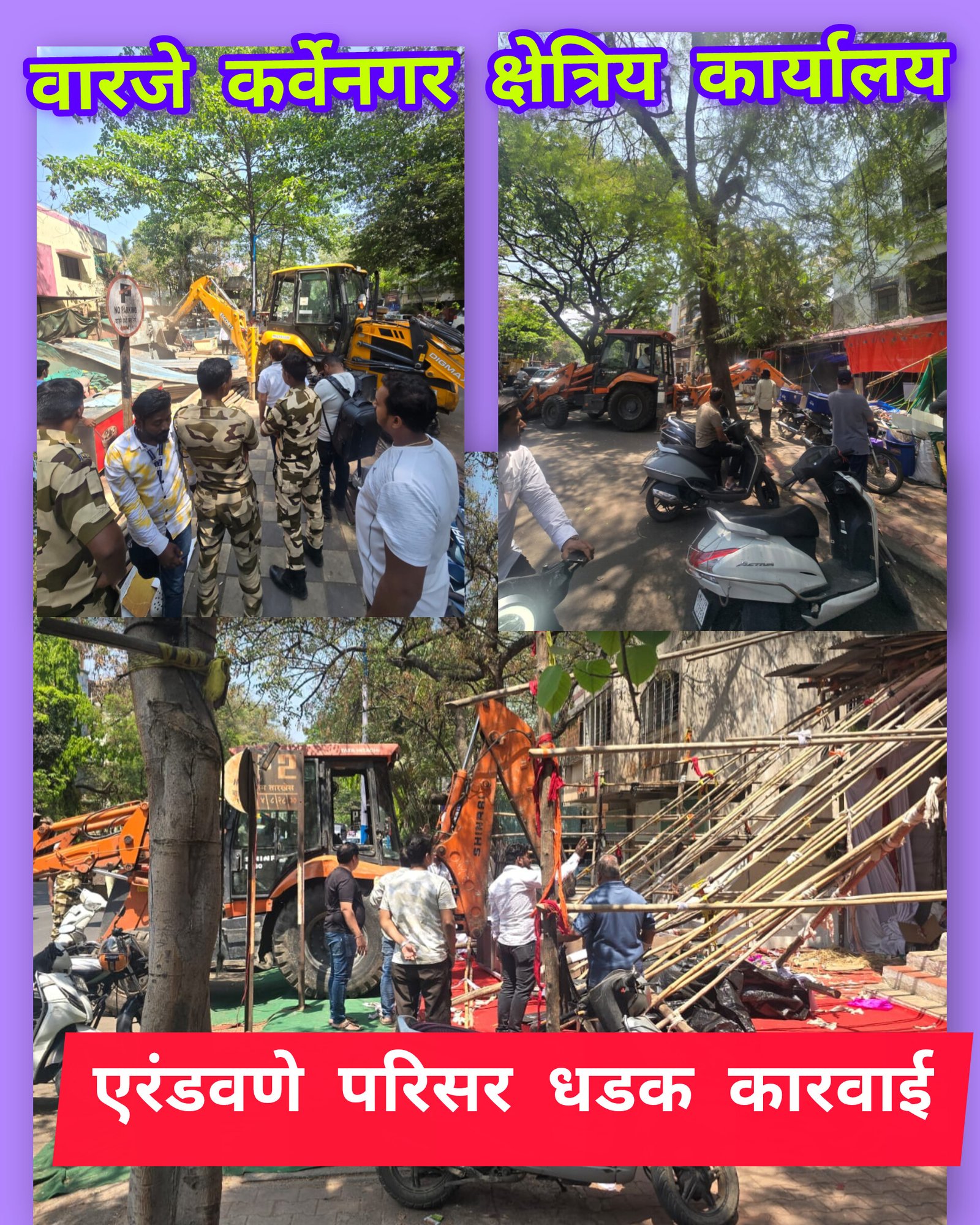 वारजे कर्वेनगर क्षेत्रिय कार्यालय हद्दीत दिनांक २०/०२/२०२६ रोजी अतिक्रमण निर्मूलन विभाग, परिमंडळ ३ व बांधकाम विकास विभाग अशी संयुक्त कारवाई करण्यात आली. तसेच वारजे कर्वेनगर क्षेत्रिय कार्यालय हद्दीत समर्थ पथ, गुलाबराव ताठे पथ, ताथवडे उद्यान पथ परिसर येथे अनधिकृत व्यवसाय व बांधकामावर अतिक्रमण निरीक्षक श्री मंदार राजकुमार करंजे, सहाय्यक अतिक्रमण निरीक्षक अविनाश चव्हाण, तेजस दाभाडे, अमोल भालेराव, लक्ष्मण जोंधळे, धनकवडी सहकारनगर कार्यालयाचे अतिक्रमण निरीक्षक श्री सागर विभूते सहाय्यक अतिक्रमण निरीक्षक श्री मंथन आमले, अतिक्रमण निरीक्षक श्री राहुल डोके कोथरूड बावधन क्षेत्रिय कार्यालय, महाराष्ट्र सुरक्षा बलाचे जवान, बिगारी सेवक यांच्या मदतीने करण्यात आली. यामध्ये १०,००० चौरस फूट भाग अतिक्रमण मुक्त करण्यात आला तसेच ४ ट्रक साहित्य जप्त करण्यात आले.