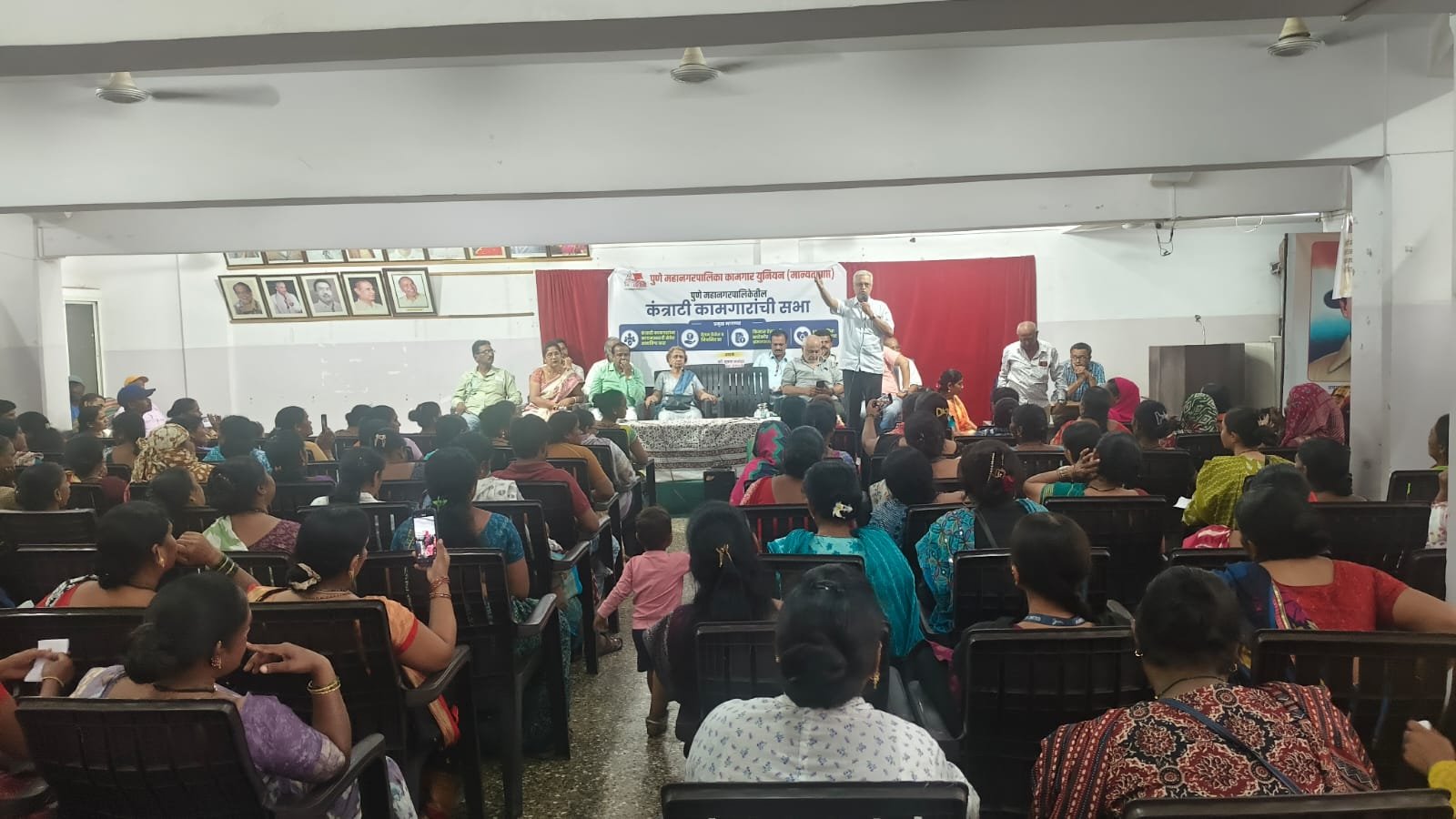 पुणे महानगरपालिकेच्या सर्व खात्यातील सफाई कंत्राटी कामगारांचा मेळावा शनिवार दिनांक २५/०४/२०२६ रोजी श्रमिक भवन एकलव्य सभागृहात आयोजित करण्यात आला होता. सदर मेळावा पुणे महानगरपालिका कामगार युनियनच्या जनरल सेक्रेटरी कॉ. मुक्ता मनोहर यांच्या अध्यक्षतेखाली पार पडला. पुणे महानगरपालिकेच्या घनकचरा व्यवस्थापन खात्यातील सार्वजनिक स्वच्छता विभाग, कचरा वहातुक विभागात एकूण ६,९०० स्त्री पुरुष कंत्राटी सफाई कामगार तसेच ३००० हजार सुरक्षा रक्षक तसेच उद्यान विभागात २५०० कंत्राटी सफाई कामगार असे एकूण १२,४०० कंत्राटी कामगार म्हणून सन २००७ पासून कार्यरत आहेत.